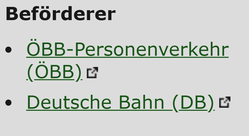 Sur le site vagonWeb, vous pouvez rechercher des numéros de train individuels. Cependant, il n’est pas possible de rechercher des correspondances. Si plusieurs trains portent le même numéro, vous devez sélectionner le bon itinéraire du train. Ensuite, le Carrier (Transporteur) s’affiche. Pour les liaisons transfrontalières, plusieurs opérateurs sont indiqués.